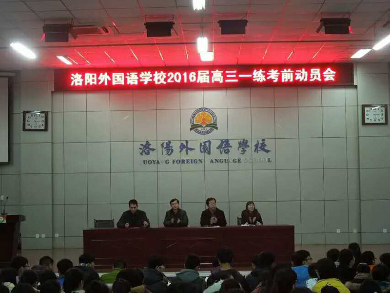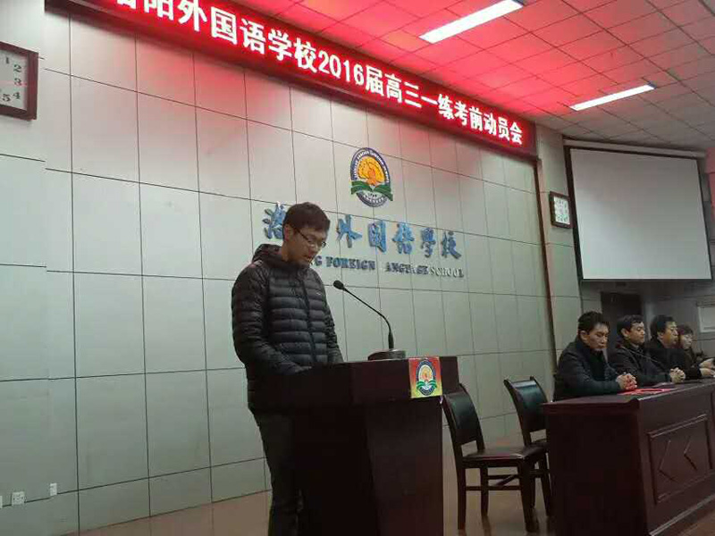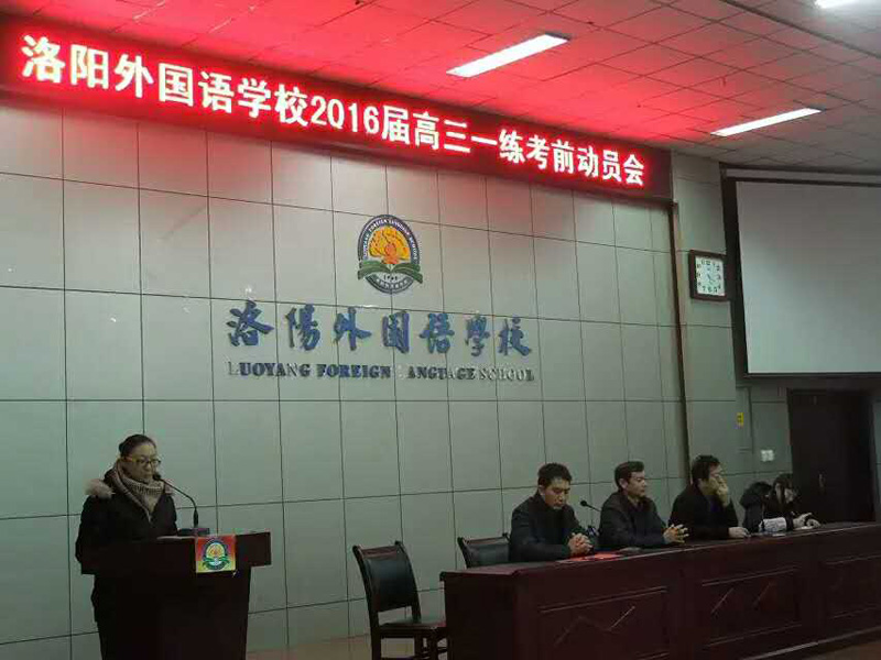 20151216日下午,洛阳外国语学校高三年级一练动员大会在科技楼阶梯教室隆重召开。大会由王定国副校长主持,段华松校长、项伟副校长、王建国主任、樊华主任、李丽峰组长应邀出席本次大会。