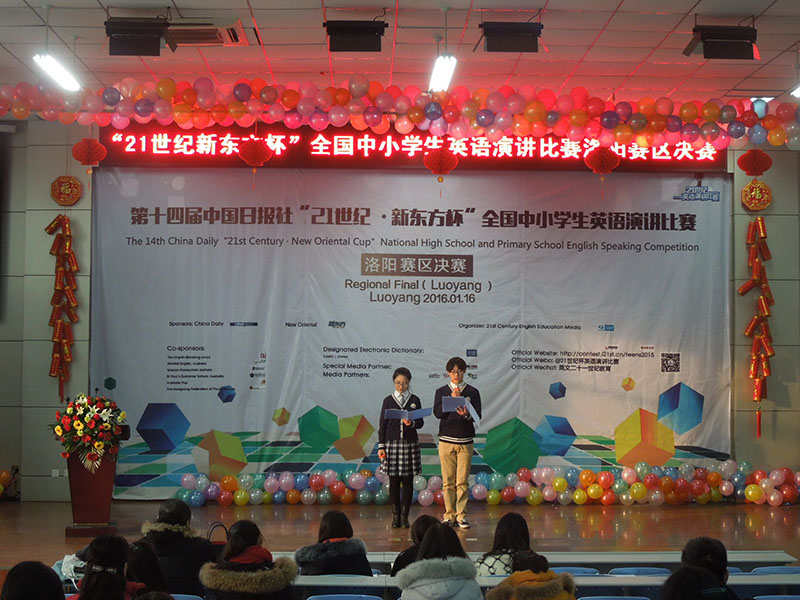 2016116,第十四届中国日报社“21世纪 新东方杯”全国中小学生英语演讲比赛洛阳赛区总决赛,在洛阳外国语学校圆满落幕。“21世纪杯”全国中小学生英语演讲比赛由中国日报社于2002年创办,二十一世纪英语教育传媒承办,每年面向全国在校中、小学生举行,是国内学术档次最高、组织最为严谨的英语学习竞赛,为每年5月在英国伦敦举行的国际英语公众演讲比赛选拔选手。为保证比赛的学术水平,评委除了中国日报河南记者站办公室副主任齐心外,还邀请来自河南师范大学以及郑州外国语的老师。选手除了自备演讲之外,还要回答评委的现场提问。洛阳外国语学校高度重视此次比赛,从组织到现场展示了我校团队的高效与 严谨,从本次大赛的获奖情况更能透视出洛阳外国语学校英语教学的特色。