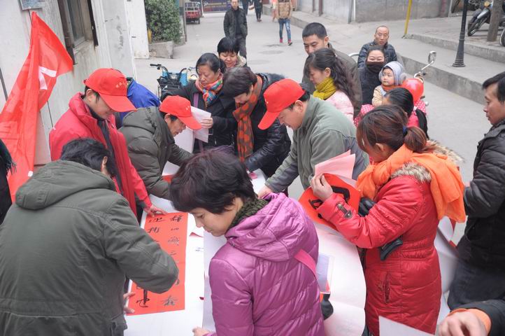 羊歌盛世方报捷,猴舞新春又呈祥。2016年1月29日下午,洛阳外国语学校志愿者服务队组织学校的书法爱好者携手市著名书法家走进行署路8号院开展“情系社区,送福送春“义写春联送祝福活动。一幅幅词章美妙的春联,寄托着人们对新年的热情与希望,承载着新春的喜庆与欢乐。书法家们挥毫泼墨,一幅幅喜庆春联成了抢手的“精神年货”,来领取的市民络绎不绝。市民们纷纷表示,此项活动意义非凡,吉祥如意的春联不仅为广大群众送出一份温暖的新春祝福,传播了中国传统文化,也让这个年味更浓了。