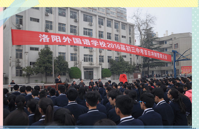 2016年3月16日下午4时20分,洛阳外国语学校初三全体师生在西校区隆重举行了“2016届初三中考百日冲刺誓师大会”。段华松校长、项伟副校长、王定国副校长、初三全体教师及各班家长代表参加了誓师大会。