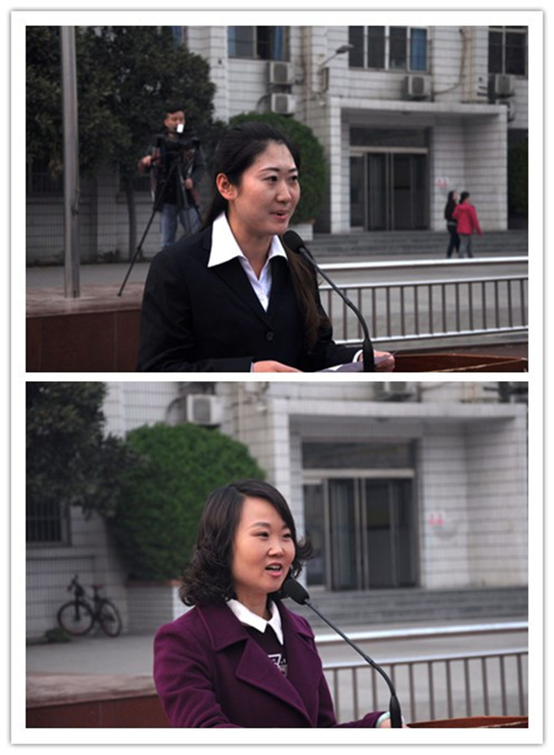 初三、5班学生代表贠佳颖代表全体初三学子发出郑重承诺:在未来一百天里,受太阳之光华,乘春风之快意,御天地之灵气。必作强者,脱颖而出;必作胜者,力压群雄。初三家长代表王廷基妈妈代表家长团队保证:在这一百天里,会一切为了孩子,一切给中考让路,全力以赴配合学校和老师做好强有力的后勤保障工作。