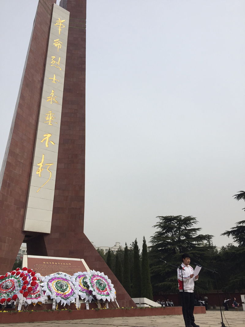 到达烈士陵园后,同学们与洛阳市其它3所学校学生共1500人参加了祭扫仪式。在本次祭扫仪式上,大家认真倾听了工作人员作的革命烈士报告,我校高一、3班学生王禹森同学作为学生代表发言,高一、8班两位同学敬献花圈。