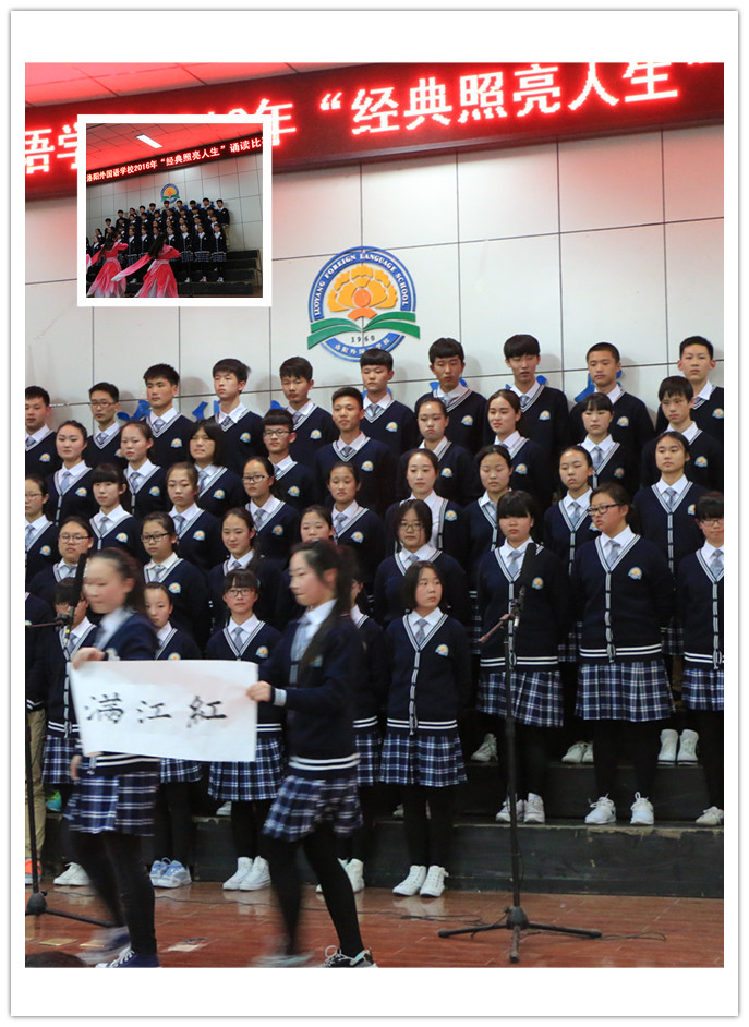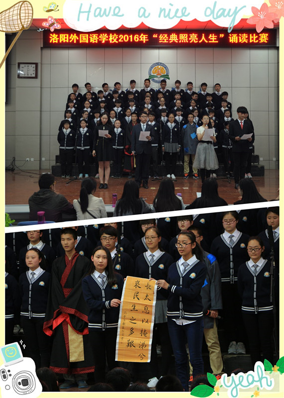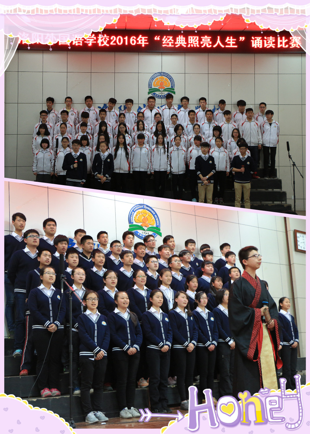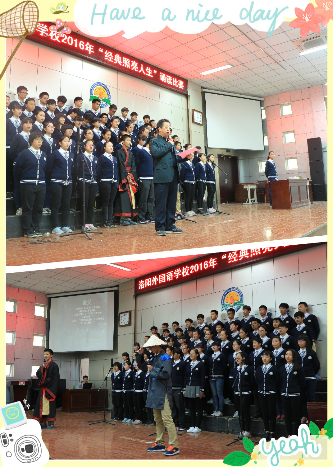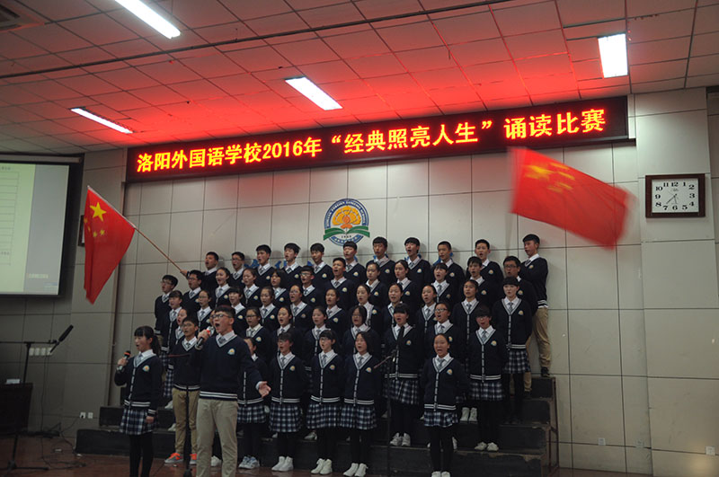 经典著作是我国民族文化教育精神的一个庞大载体,是我们民族生存的根基,也是传承民族精神的纽带。为了弘扬中华传统文化,提高师生人文素养,创建良好的校园文化,洛阳外国语学校团委、政教处于3月30日组织开展了高中部2016年“经典照亮人生”诵读比赛,我校高一、高二年级共21个班级参加了本次诵读比赛。