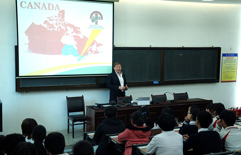 会见结束后,Vict先生给我校国际班学生及初三有意项出国的学生进行加拿大文化讲座,让更多的孩子了解到加拿大教育现状。Vic先生纯正的英语,亲和的态度,近跟离地跟学生交流,让孩子们备受鼓舞,用英语交流的积极性明显高涨!在Questions and Answers 环节,孩子们一个个踊跃提问,Vic先生很耐心回答孩子们的问题,让他们对中西方教育的差别更为清晰。他对每次到中国都发现中国快速发展表示惊叹,同时表示希望中国文化能保持自身的优良传统!希望中加项目能走向更深度合作,为更多洛外学子提供更多优质教育资源!
