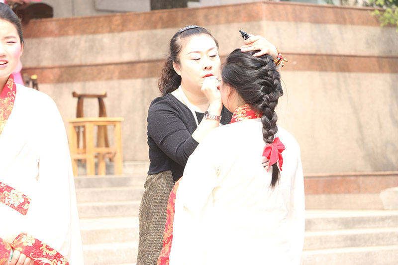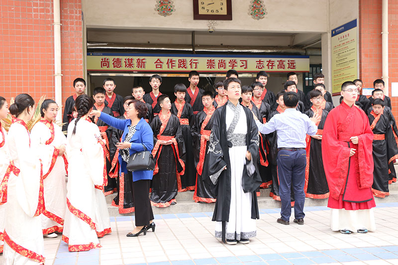在节目的排练过程中,学校领导高度重视,对诵读节目的相关工作进行了部署,胡伟民副校长、路红副校长亲自指导,袁峰、郭洁琼、张奇组成指导教师组,每天利用大课间以及下午第四节课的时间加班加点排演节目;高中部秦恺主任,朱乐懿、陈秋兰等老师反复斟酌撰写串词,制定了高水平的演出文案,为成功演出打下了坚实的基础;音乐组尤丽、铁晓琳等老师牺牲午休时间帮助同学们化妆、指导舞台效果;初二年级班主任们全力配合任劳任怨,大家都有一个共同的愿望,那就是把本次节目作为检验我校经典诵读的一个平台,展示我校素质教育的成果和师生齐心协力、锐意进取的精神风貌。